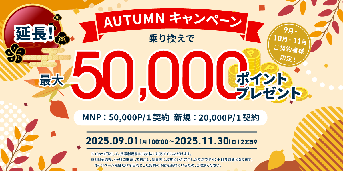 LPmobile CAMPAIGN 11/30迄 【格安SIM】【LPmobile】秋の乗り換えキャンペーン|乗り換えで5,000円分のポイントもらえる 11/30までのお申込み(申込~決済まで完了)でもらえます。MNP乗り換えで5,000円分/1契約、新規は2,000円分/1契約のポイントがもらえます。 初月事務手数料 ¥3.773(税込) eSIM対応・最短 当日 開通 さらに、契約するとユーザー特典として... 紹介チケット当てて、家族紹介で ¥1,500分のポイント/1契約(家族はチケット分1~3か月間プラン料が無料) 今すぐ申込み 詳細を見る →